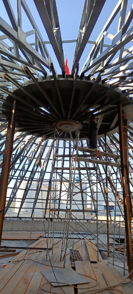 鋼板倉網(wǎng)架頂結(jié)構(gòu),由螺栓球、光管、套筒等組裝而成。網(wǎng)架頂一般用于中大直徑的倉頂上。(圖為直徑42米蘭炭鋼板倉倉頂結(jié)構(gòu))